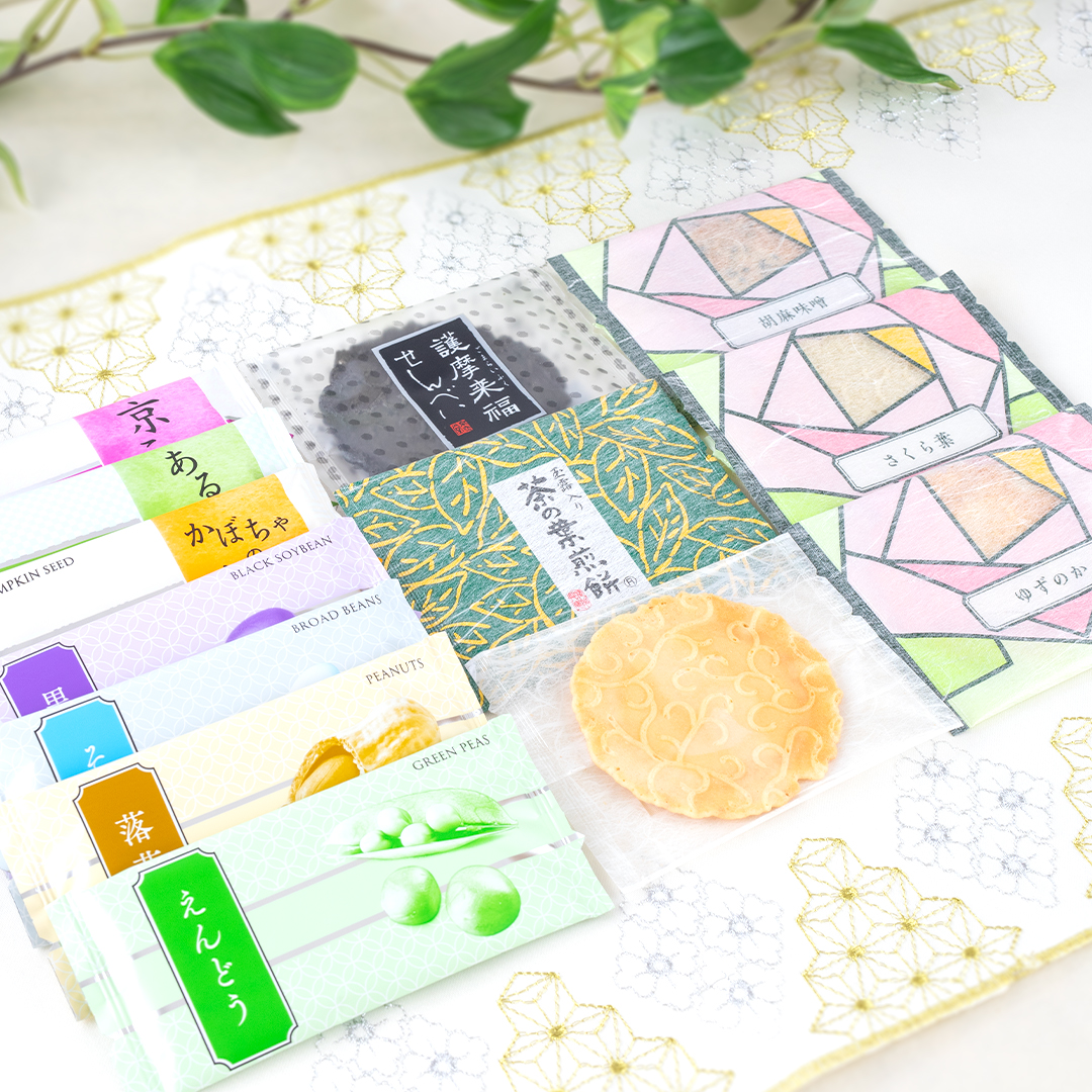 (茶の葉煎餅、ゆずのか、胡麻味噌、